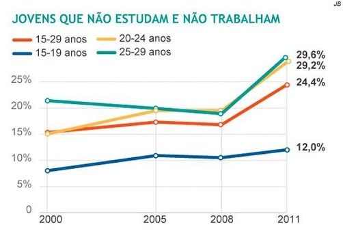 Idade: 19 a 24 anos. Não trabalha, não estuda, não procura emprego. São um milhão e 500 mil jovens nessa situação no Brasil, mostra uma pesquisa realizada pela Fundação Getúlio Vargas. Eles representam 10 por cento dos que estão na faixa dos 19 aos 24 anos.